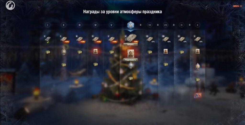There are a total of ten levels of atmosphere and five levels of jewelry (5, maximum rarity). Your level of holiday atmosphere depends on the rarity of the jewels and their number in the hangar. By default, all players will start from level I and receive a gift: a MKA tank, a German level II premium, with a garage space and 100% of the crew. Each new level guarantees additional rewards, including discounts on tier I – X vehicles, personal reserves, equipment and slots in hangars.