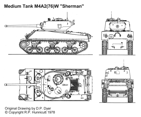 L’M4A2(76)W venne costruito dalla Fisher Tank Arsenal, Pressed Steel Car. Circa 2915 veicoli vennero costruiti tra maggio 1944 e maggio 1945. L’armamento principale fu un canone da 76mm (M1A1, M1A1C, M1A2). Era alimentato da un motore diesel General Motors 6046 di 410cv@2900rpm, che permetteva una velocità massima di 46km/h. Il veicolo ricevette il suffisso W (wet, asciutto), perchè la stiva munizioni era particolarmente protetta dalla possibilità di prender fuoco.