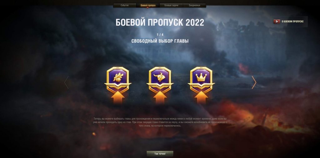• Rewards for completing the stages of the Battle Pass are awarded only after choosing a chapter. After its completion, you need to select the next one to be executed.