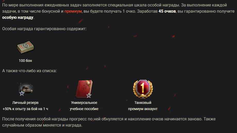 As you complete daily tasks, a special reward scale is filled. For each task, including bonus and premium, you will receive 1 point. Having earned 45 points, you are guaranteed to receive a special reward.