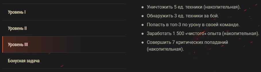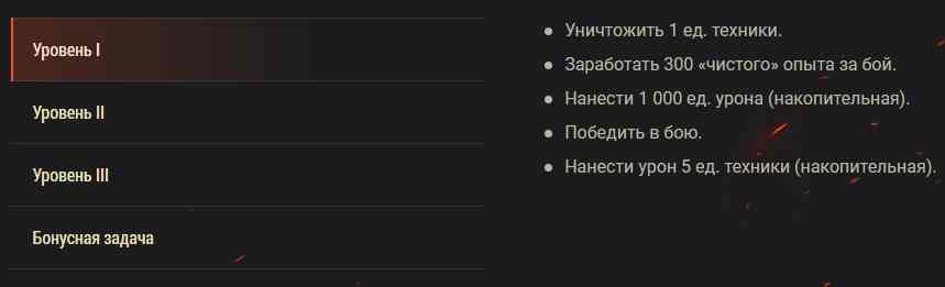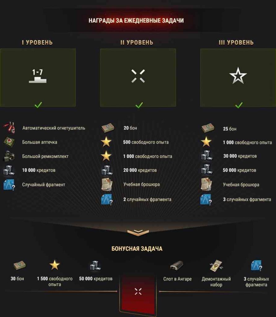 In the “Daily Tasks” tab in the Hangar, you will find three combat missions with an increasing level of difficulty that can be completed simultaneously. Task conditions are displayed in the Tasks tab or in the Hangar. The conditions will be similar to the following: (see 2-5 screenshots).