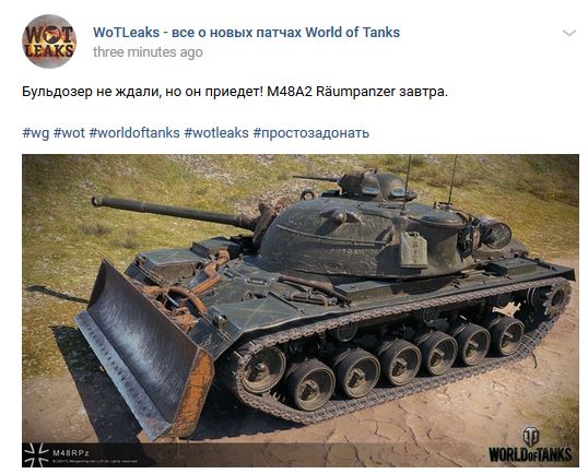If you believe in leaks, the German M48 RPz will appear tomorrow. The information comes from the Russian WoTLeaks, as usual, and as yesterday