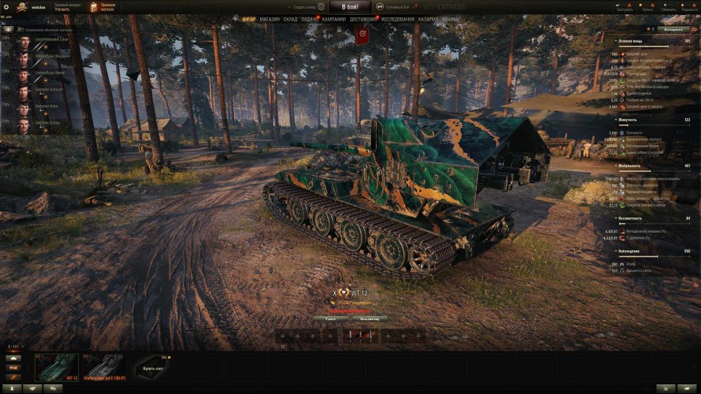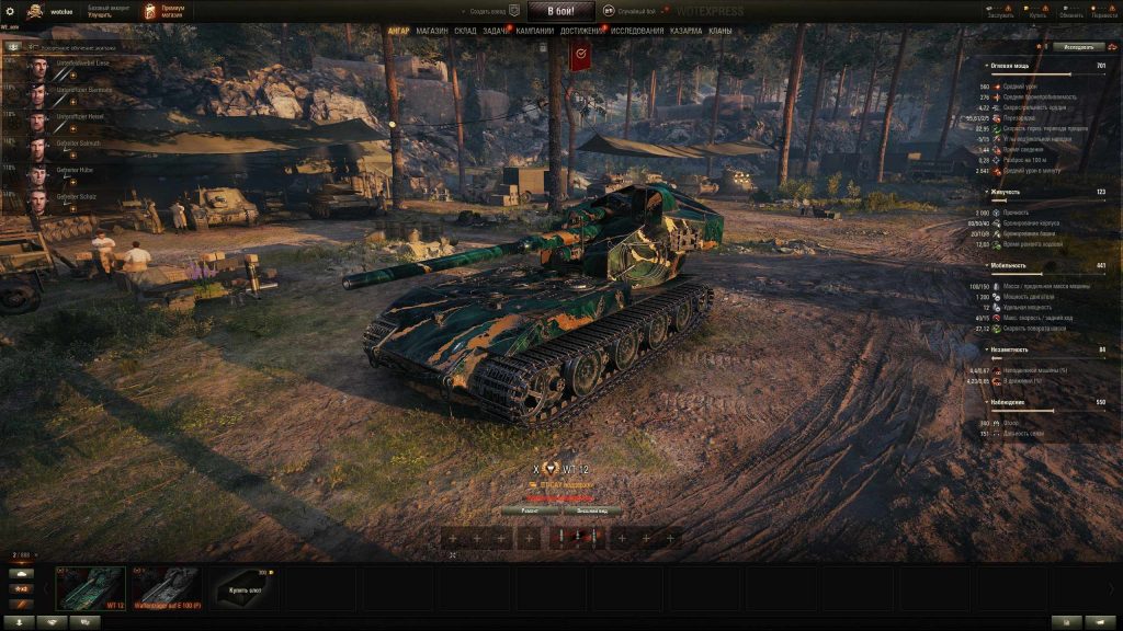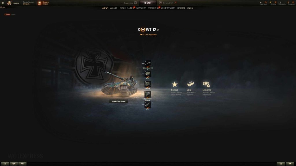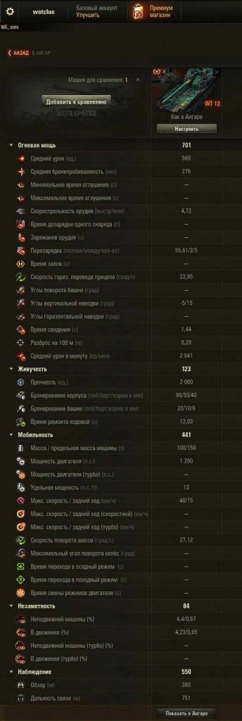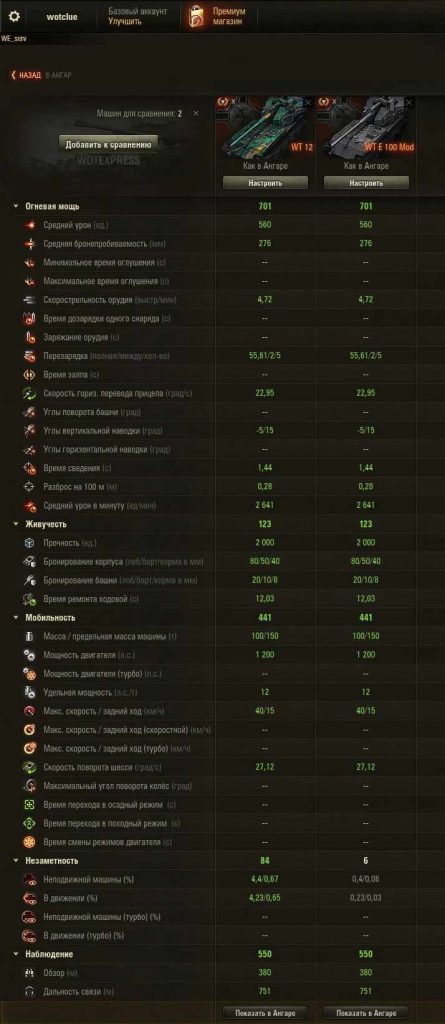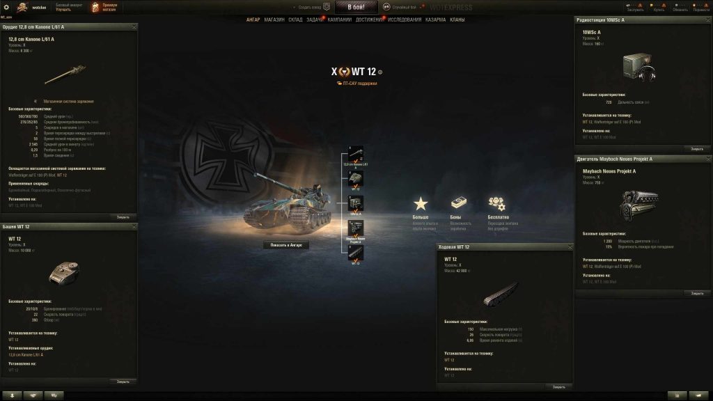 The tank does not have a full name, i.e. WT 12 is the full name. Those. the name in the game files: Waffentrager_E100_WO WT 12 is a complete clone of the Waffentrager auf E 100 (P) Mod tank, with only a small tech. difference. WT 12 has its own built-in camouflage and different vehicle status. Comparison: Waffentrager auf E 100 (P) Mod — WT 12