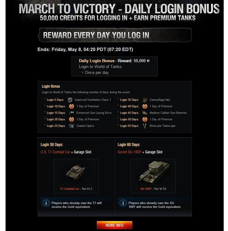 Here is the official pics that explain exactly how daily login bonus works. The event will end on may 8 2015. For every day, daily login bonus is 50.000 credits. After 5 days you will get an improved ventilation class 1; after 10 days one day premium; after 15 days an enhanced gun laying drive; after 20 days one day of premium; after 25 days 1 coated optics; after 30 days an US T7 Combat Car plus a garage slot; after 35 days a camouflage net; after 40 days 1 day of premium; after 45 days medium caliber gun rammer; after 50 days another 1 day of premium; after 55 days a binocular telescope; at the end, after 60 days, you will get a SU-100Y, tier 6 premium soviet tank destroyer. Enjoy free stuff!