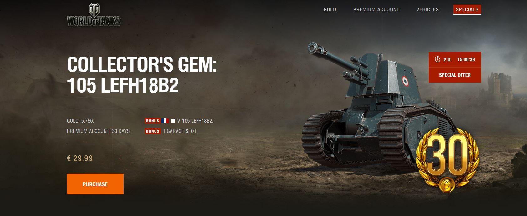 This edition of the Collector’s gem of the Week features a month of Premium Account and a good deal of gold for additional expenses. As a bonus, you will receive a free gift – the unique leFH18B2 premium SPG. It may not deal much damage per shot, but this is compensated for by its astonishing rate of fire, aim time and armour. That’s a combination you will rarely see in this vehicle class!