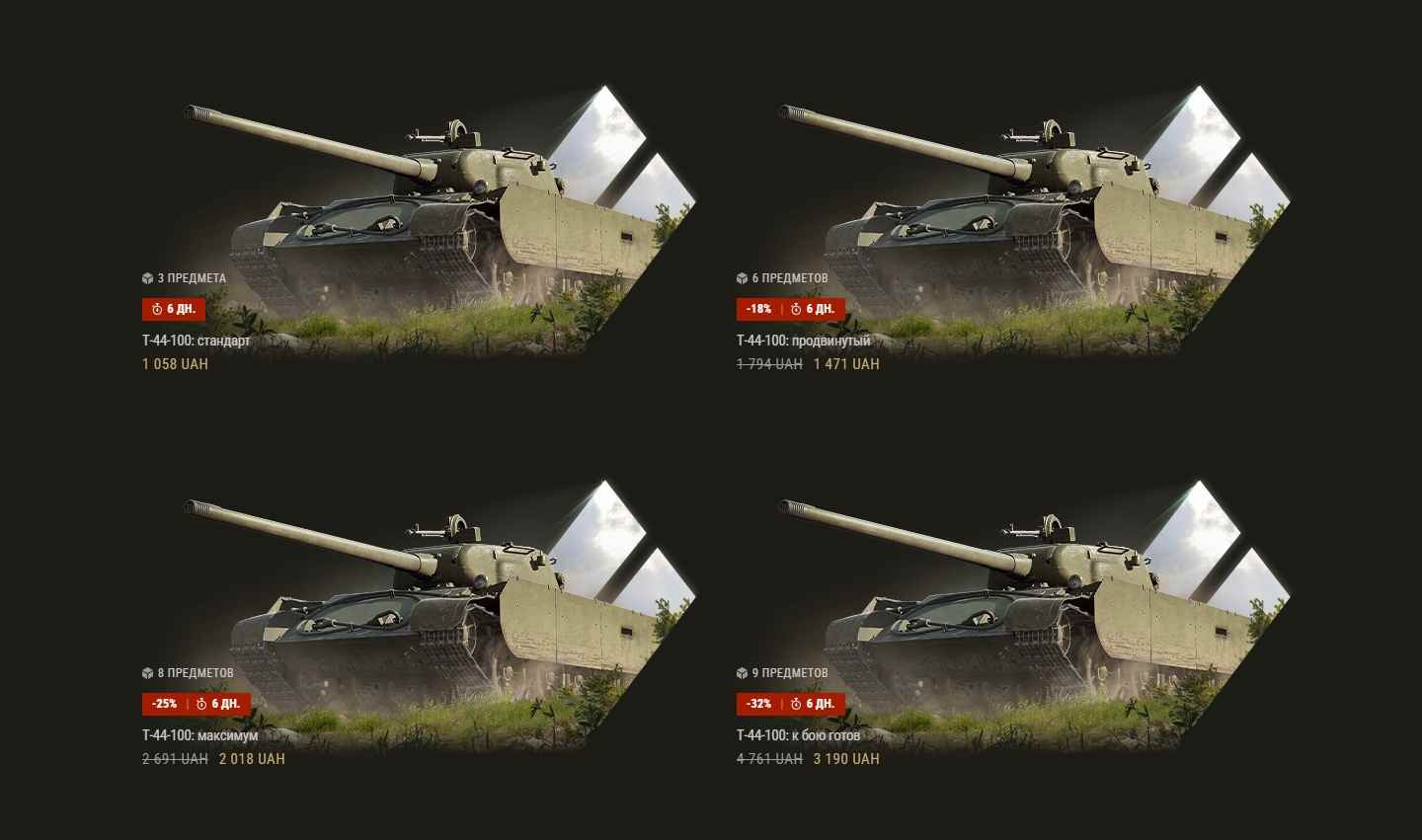 - T-44-100 1 058/1 471/2 018/3 190 UAH, 40.72/54.37/72.32/114.07 €, 712.53/951.45/1,265.48/1,996.22 TRY, 16,560/23,025.60/31,590/49,928.40 KZT
