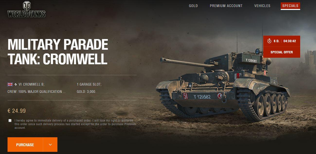 World of Tanks EU Berlin Cromwell on sale Posted on 12 May 2016 by demostene Share on Social Media x facebook redditwhatsapptelegramThe Berlin Cromwell is on sale in the EU server: VI Cromwell B; Crew: 100% Major Qualification + Brothers in Arms perk; 1 Garage Slot; Gold: 3,000. price: 25 eu Share on Social Media x facebook redditwhatsapptelegram
