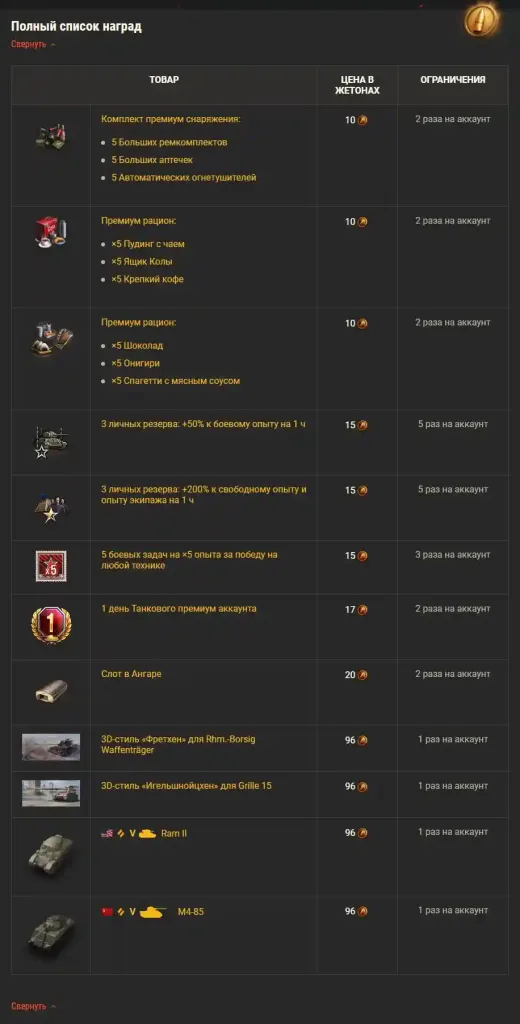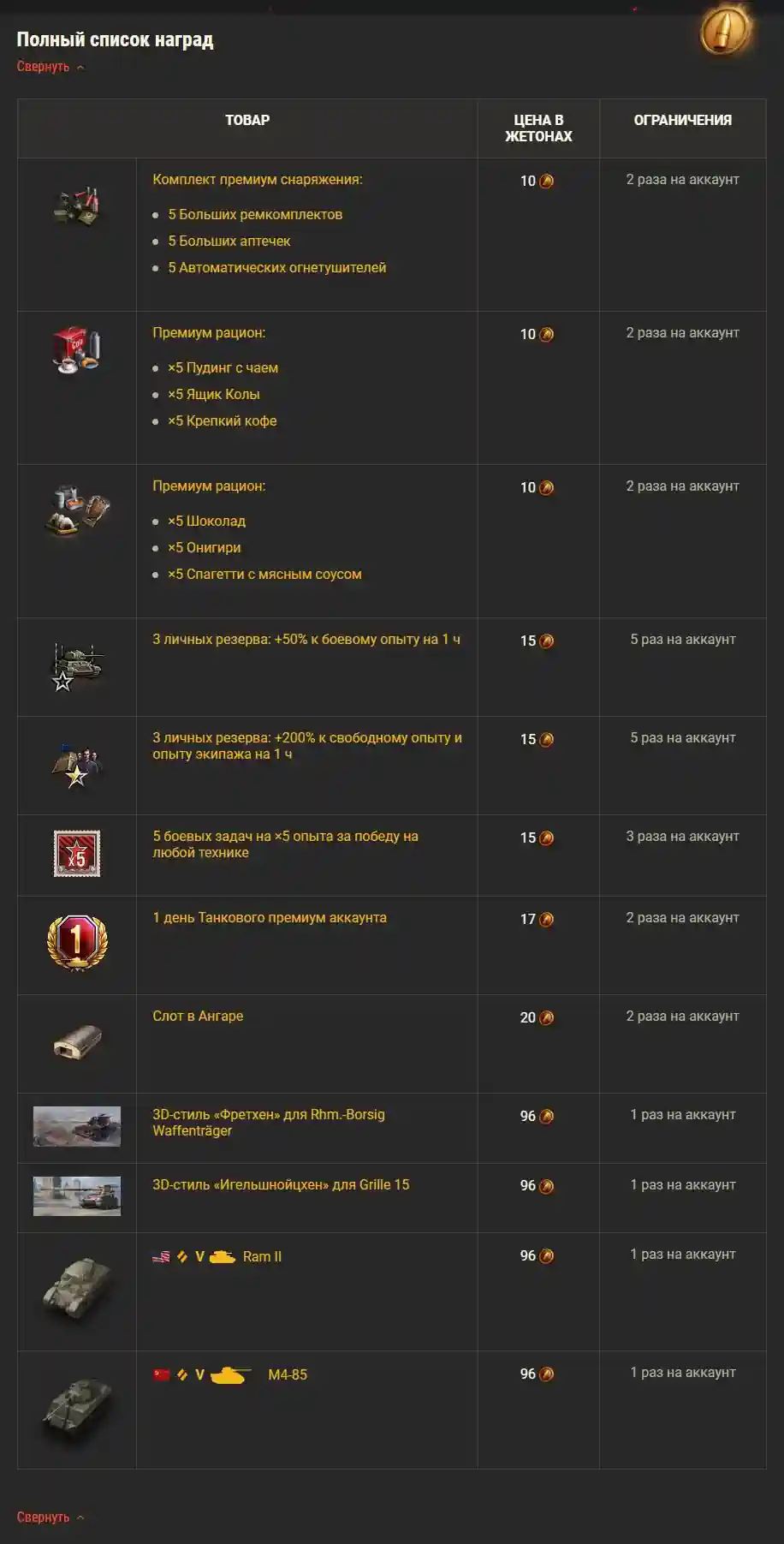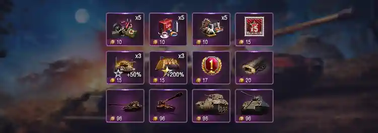 Scambia gettoni con premi speciali in una sezione speciale del Negozio: due stili 3D epici, due veicoli premium di livello V, riserve personali, razioni premium e set di equipaggiamento, compiti di esperienza o giorni di account Tank Premium. Per accedere al negozio di gettoni, vai semplicemente al magazzino nell’hangar e apri la scheda “Rifornimenti dal retro”.