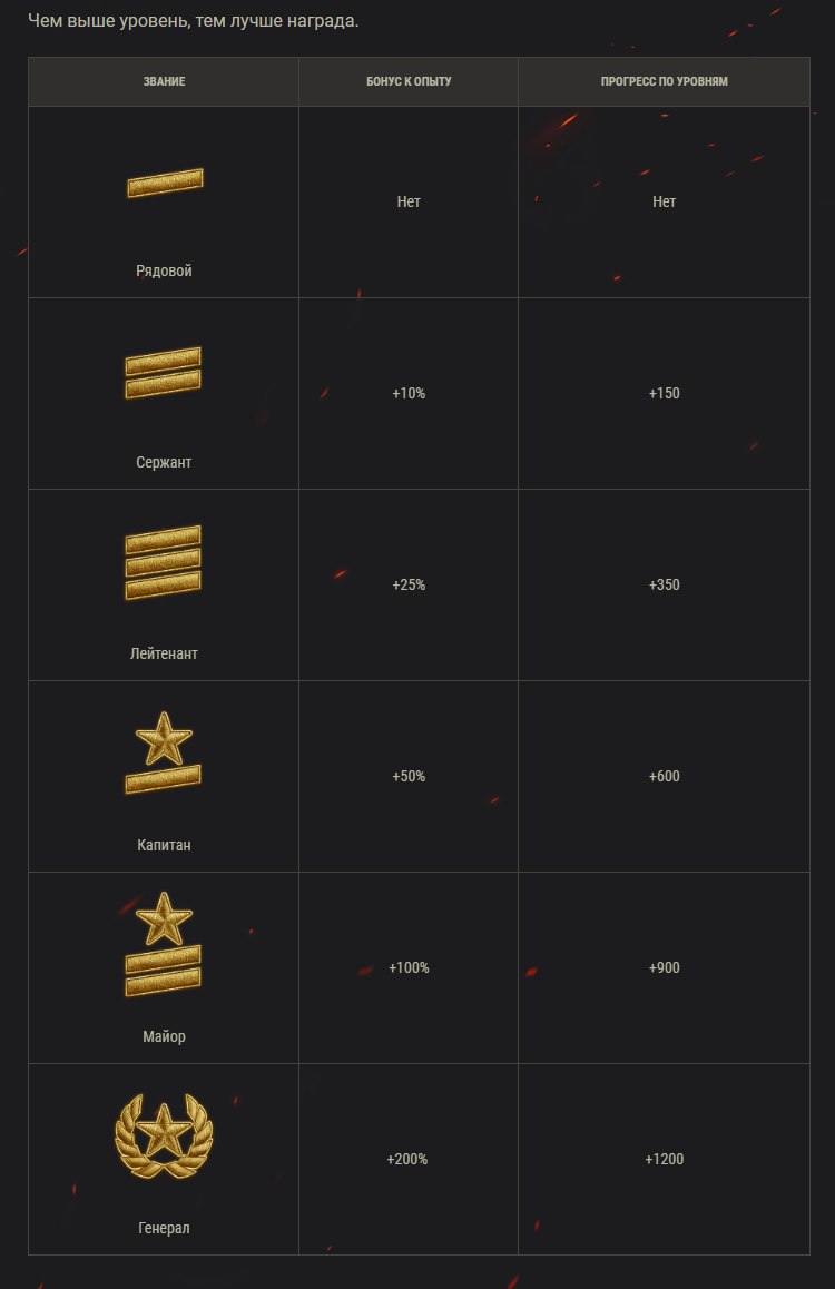 4. L’esperienza è calcolata allo stesso modo delle battaglie casuali, più i coefficienti addizionali per i ranghi. L’esperienza è distribuita su tutti i carri armati coinvolti nella battaglia, a seconda dei risultati che hai mostrato su ciascun carro armato.