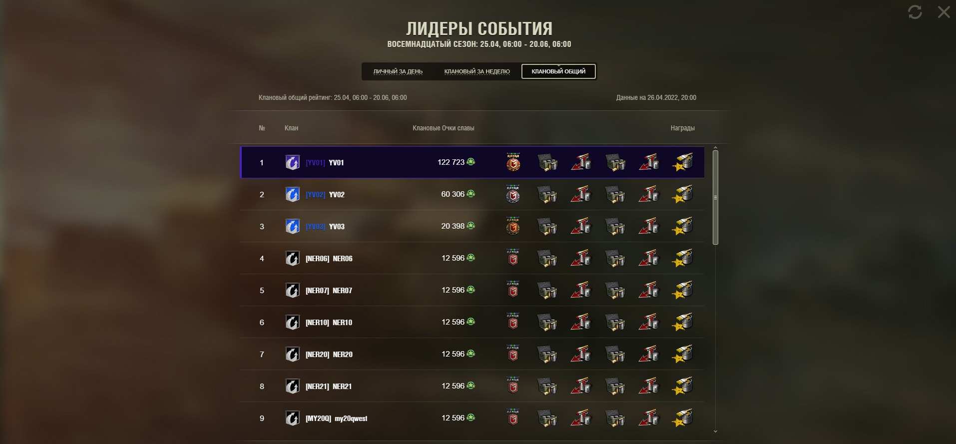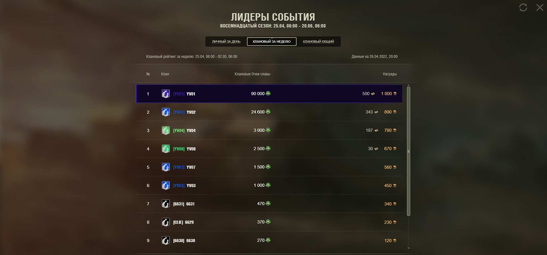 All fame points received by the clan are accumulated in the season rating. At the end of the season, depending on the position of the clan, all clan players will receive a reward.
