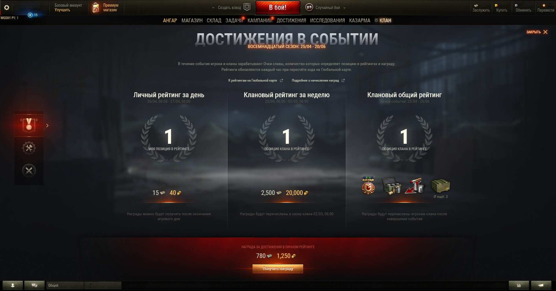 The amount of gold and bonds that will be distributed among the clans directly depends on the overall activity of the players during the week. It will be equal to the amount of gold and bonds received by players for personal rating for the whole week. At the end of the week, the clan rating is reset to zero and the cycle starts again.