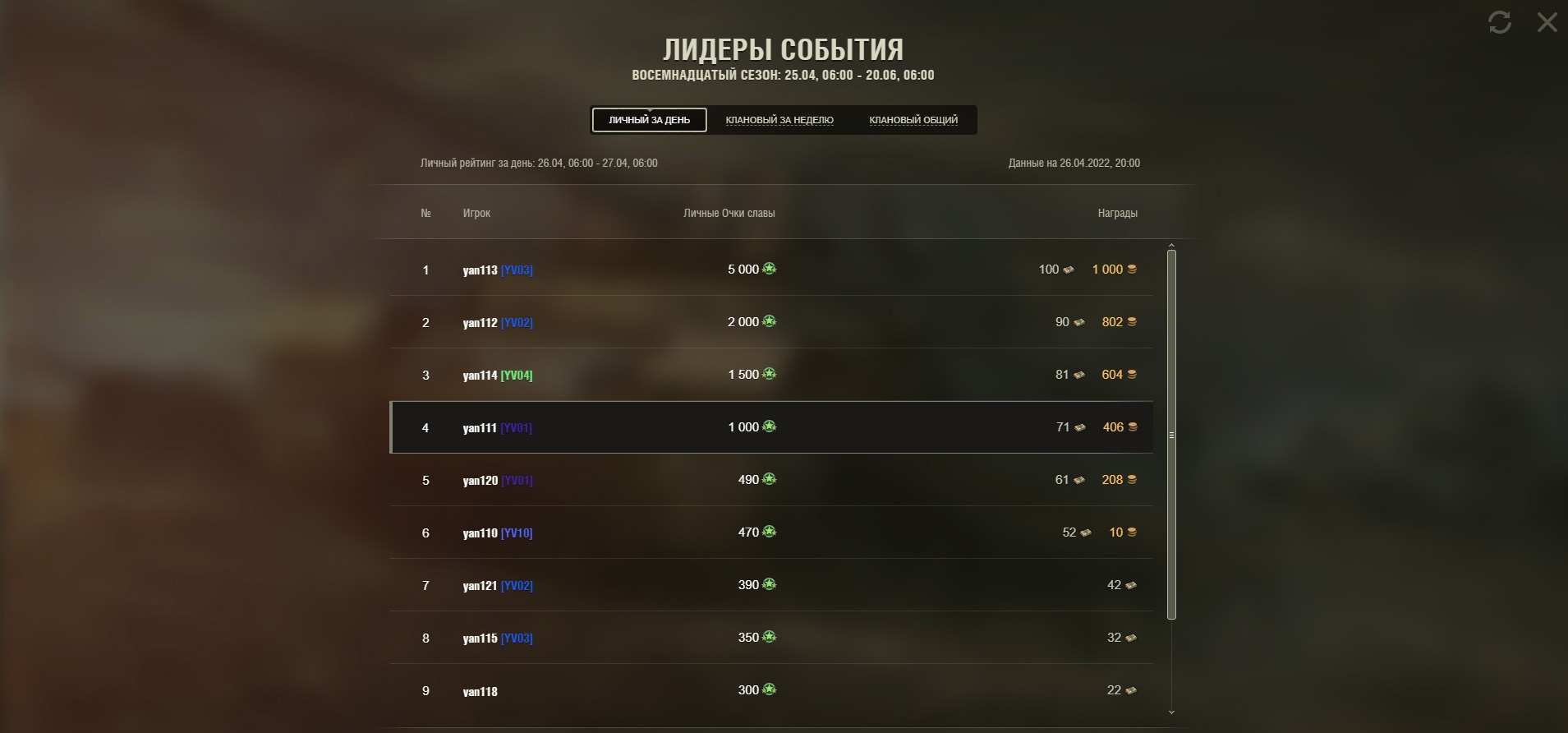 The rating is formed by personal fame points earned per day. In order to get into it, the player needs to score 15 personal fame points. Depending on the place occupied by the end of the gaming day, all participants in the rating receive rewards.