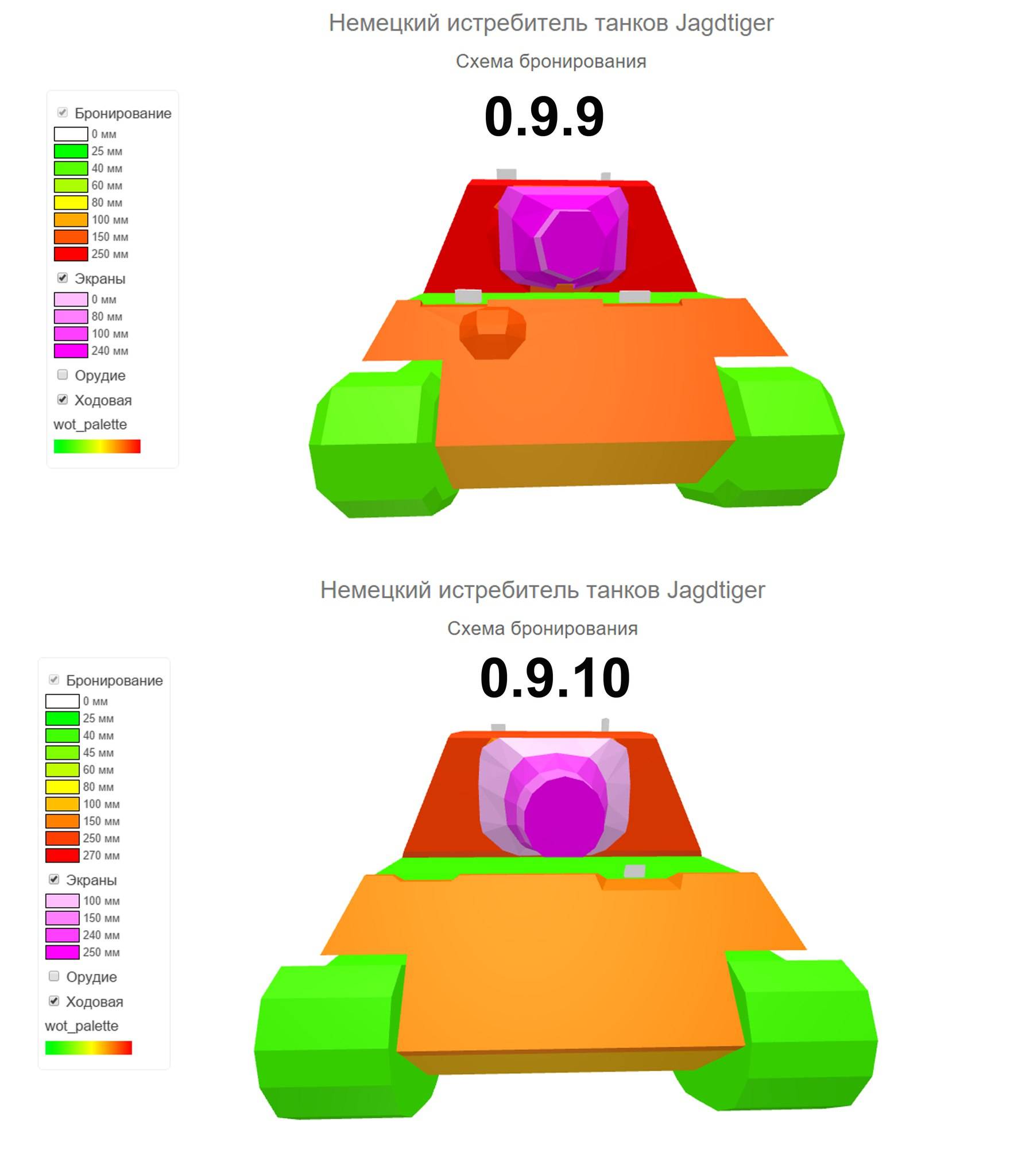 Ecco un confronto tra la corazza dello Jagdtiger nella patch 9,9 e il modello HD nella patch 9.10. Il punto debole della mitragliatrice è stato rimosso, la sovrastruttura è il vero problema. Il mantello del vecchio modello aveva 240 + 100 millimetri all’interno e 100 + 250 millimetri nella parte esterna. Il nuovo modello ha 240 + 80 millimetri nella piccola parte interna e 100 + 150 millimetri nella parte esterna.
