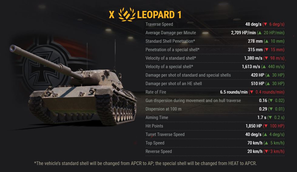 - its forward speed will increase by 5 km/h to 70 km/h, making the Leopard 1 the fastest Tier X medium tank in the game!