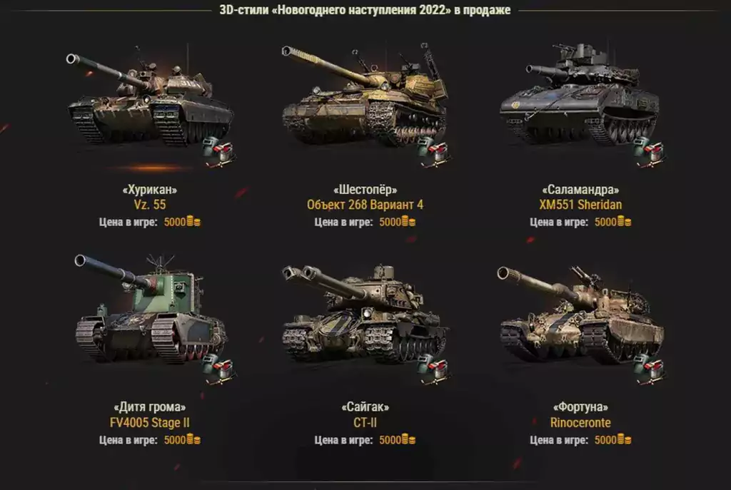 Looking for a 3D style for Tier X vehicles? If you missed the New Year’s Eve 2022, here’s your chance to purchase all six styles that dropped in the big box last year! These exclusive appearance elements will give your cars a completely new look. For example, the 3D Salamander style will turn the X XM551 Sheridan into an M551 model, and the Thunder Child style will give the X FV4005 Stage II a steam engine in the rear of the hull and sound effects similar to the sound of train wheels! These packs will be available to purchase in-game for gold until January 8, 2024.