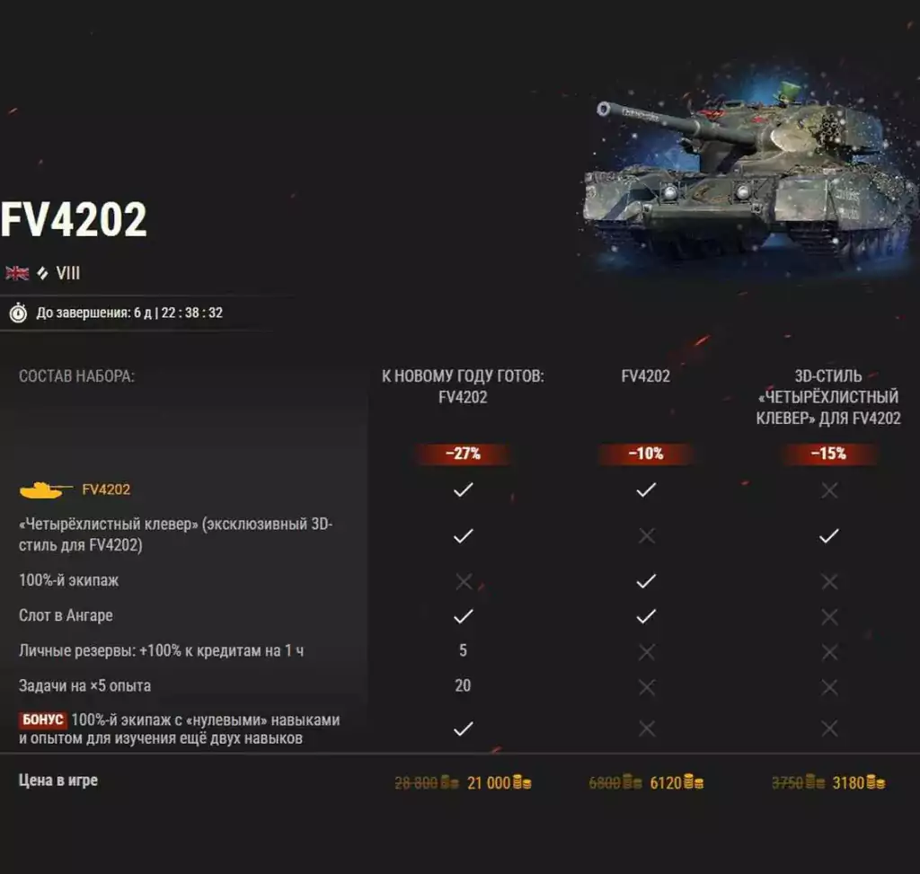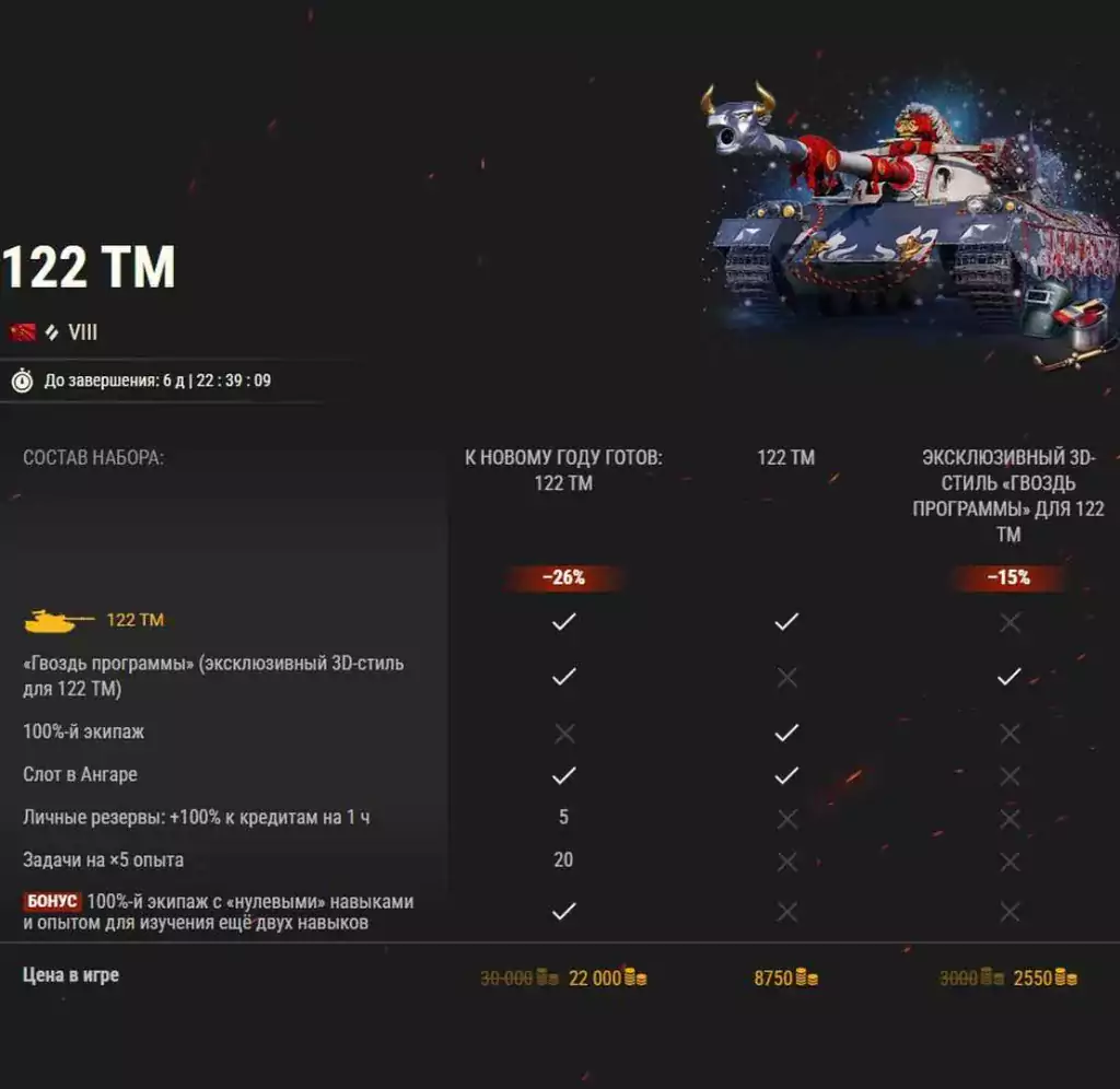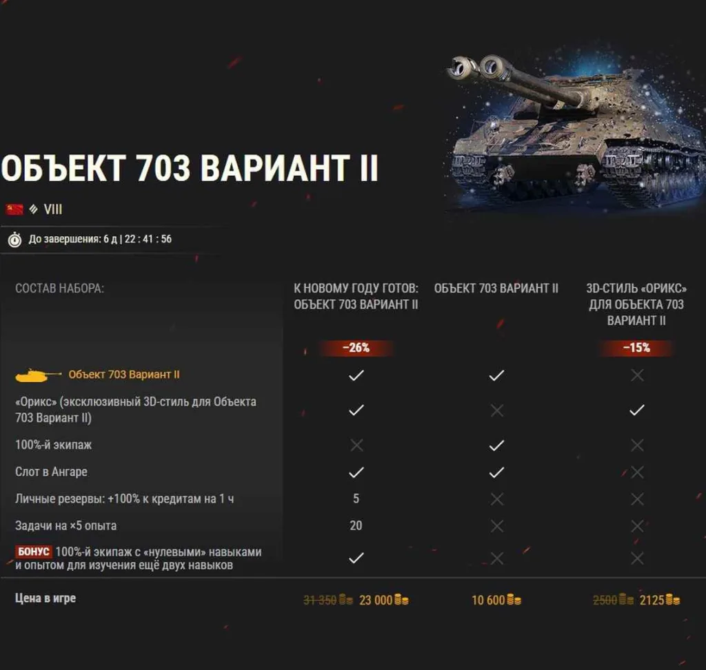 Every Friday in December you will be able to purchase several new sets in the game for gold! About three sets with an exclusive 3D style will appear in the Store every week. If you already have a carfrom the set, but no style, you can buy it separately! The first batch of sets includes VIII Object 703 Variant II, VIII 122 TM and VIII FV4202!