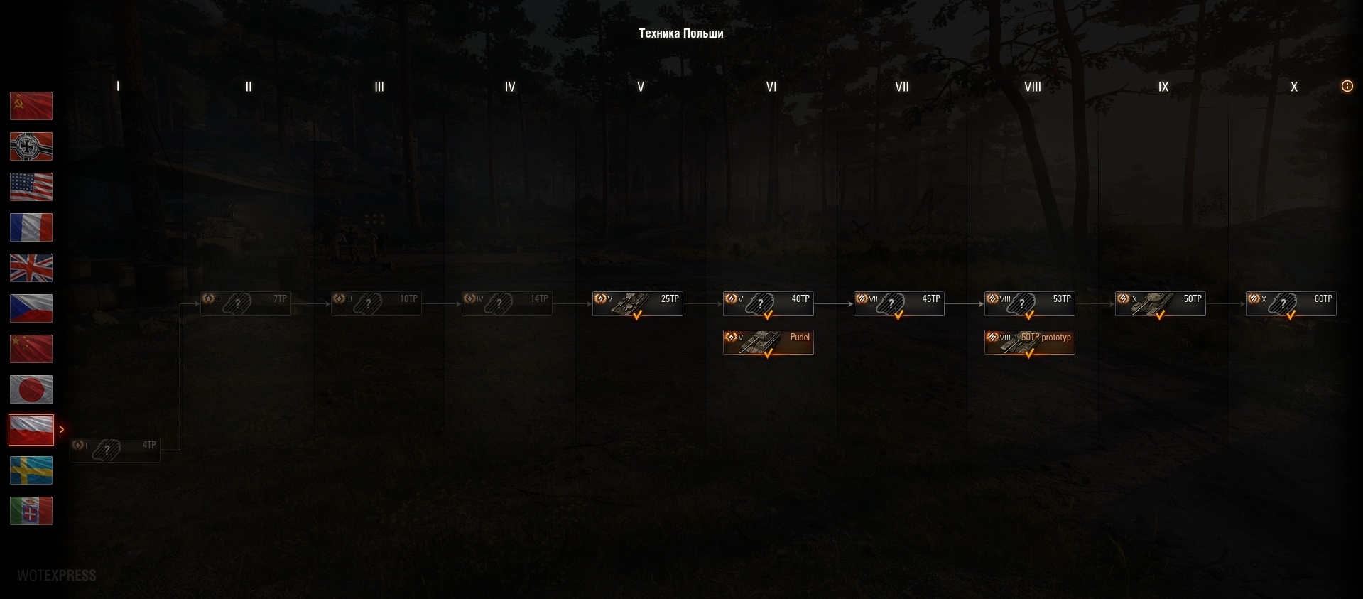 Gli sviluppatori hanno aggiornato anche l’albero tecnologico polacco, come puoi vedere, puoi acquistare Pudel e il prototipo 50TP in oro di gioco, non male …
