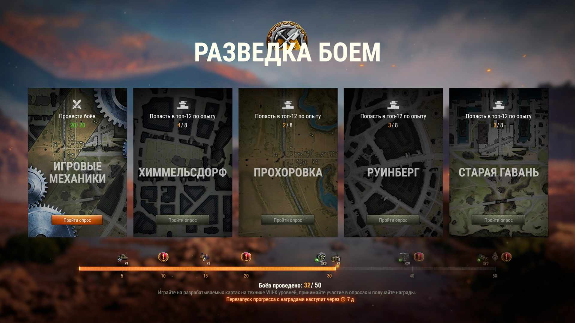 You will have the opportunity to fill out a general questionnaire after you have fought 20 battles in the “Reconnaissance by Combat” mode, in which you will be in the top 12 of your team in terms of “pure” experience. There are four additional profiles (one for each map) that will become available after you have fought 8 battles at a specific combat location (you also need to be in the top 12 of your team in “pure” experience).