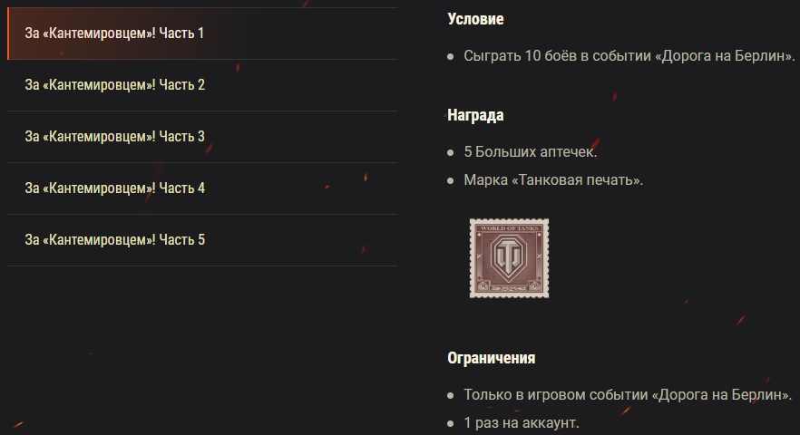 Combat missions for random battles (Part 2 – Part 5) open sequentially one after another as they progress. The combat mission for 10 battles in the event “Road to Berlin” (Part 1) can be performed in parallel with the others.