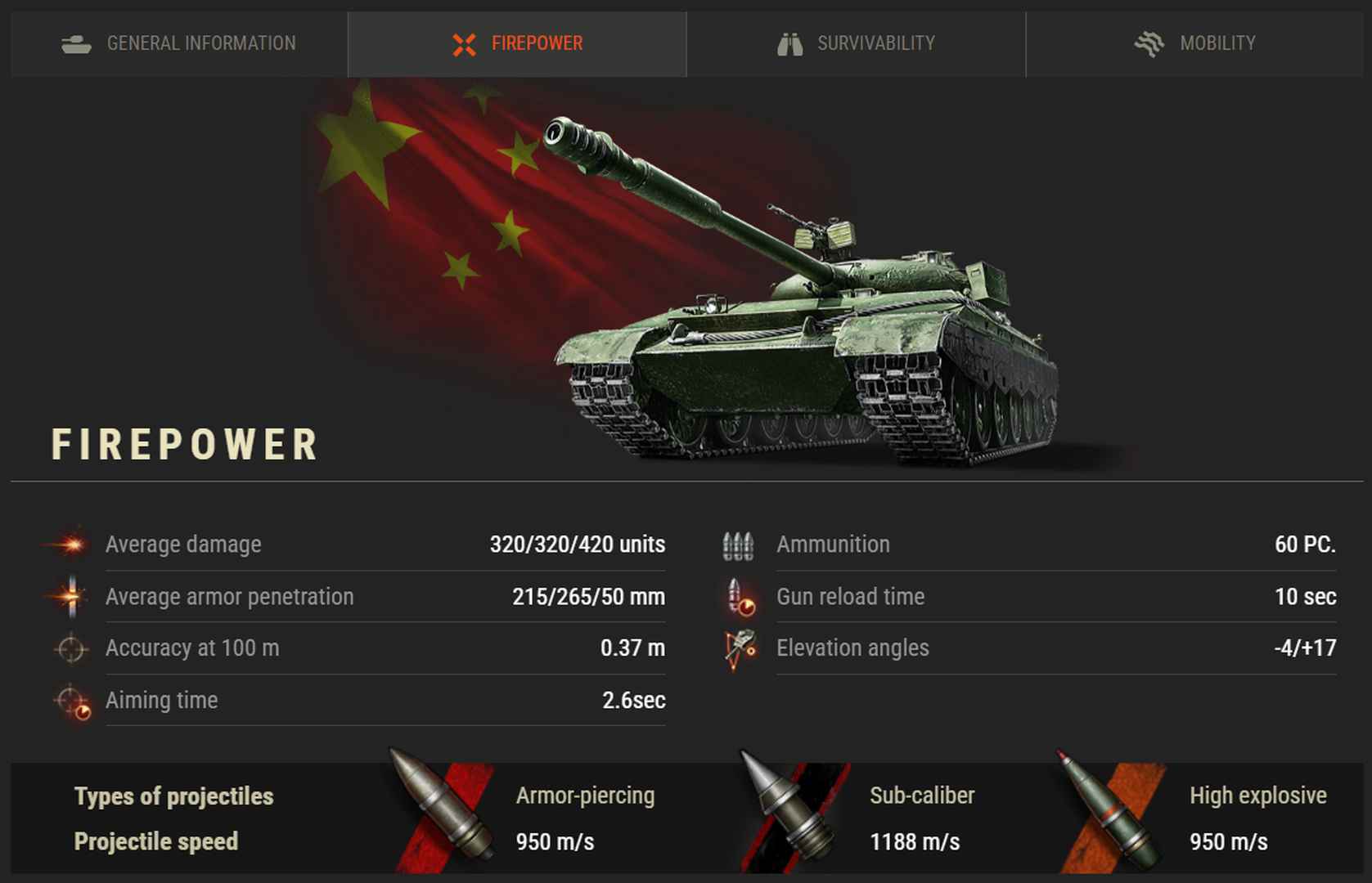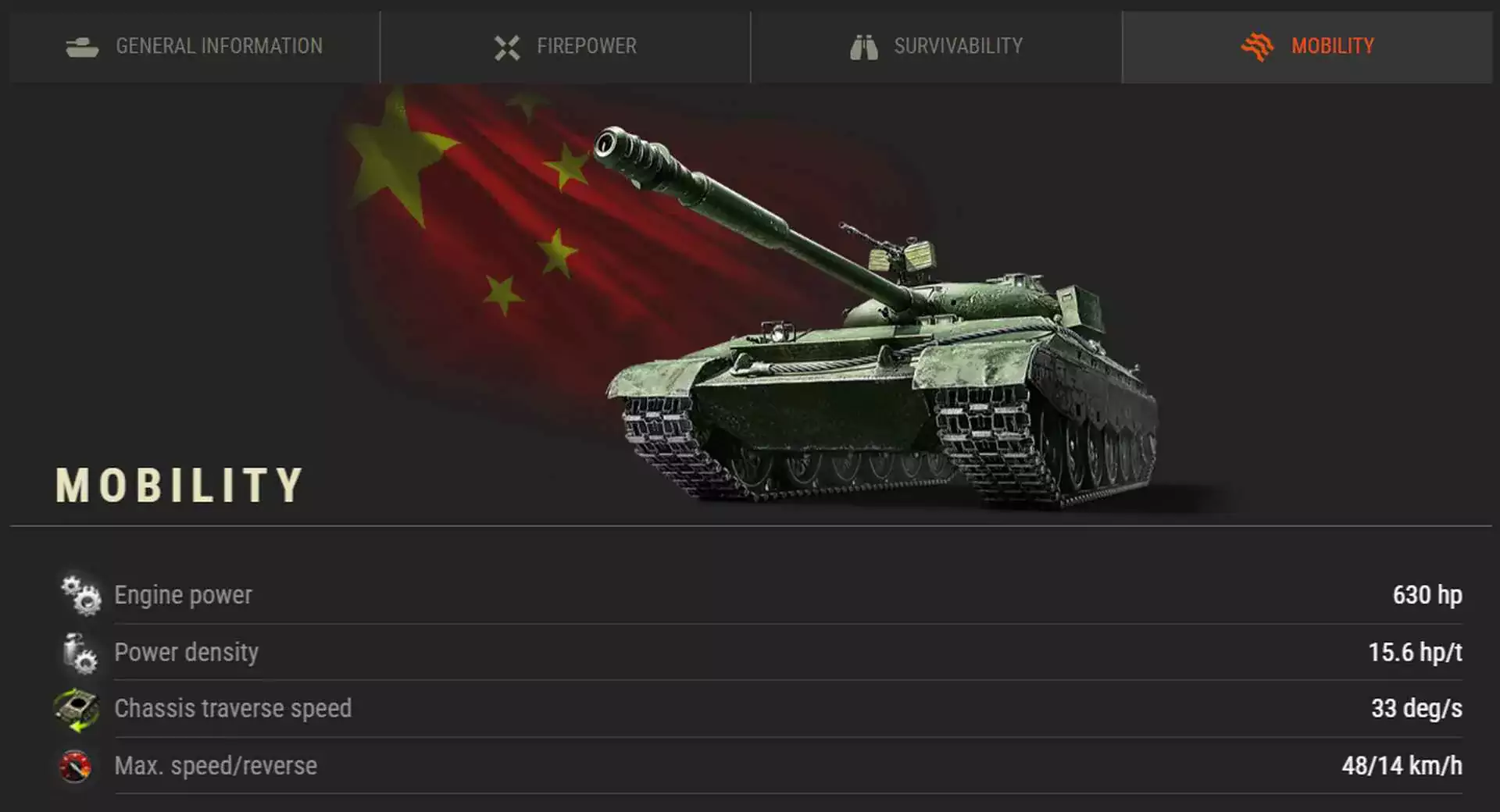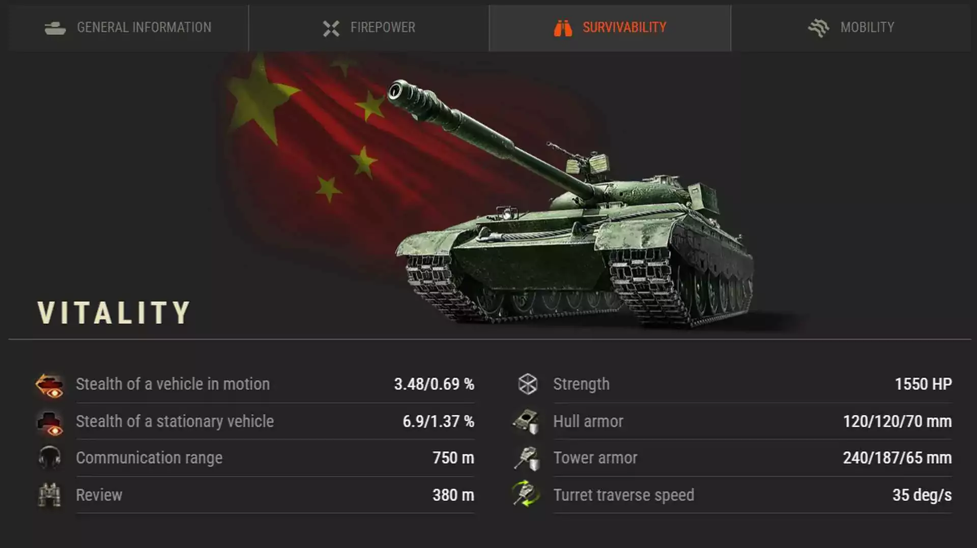 WZ-113-II has 120 mm in the front of the hull and 240 mm in the turret with “proprietary” Chinese (or Soviet) rational bouncing angles. With them, all-round protection becomes even more impressive. WZ-113-II in addition received a decent speed – 48 km/h and good stabilization will help players to remain as efficient as possible even at speed.