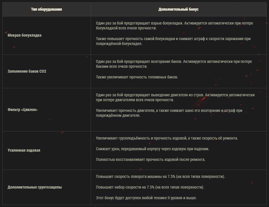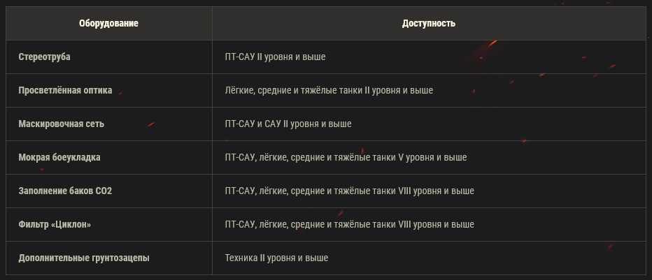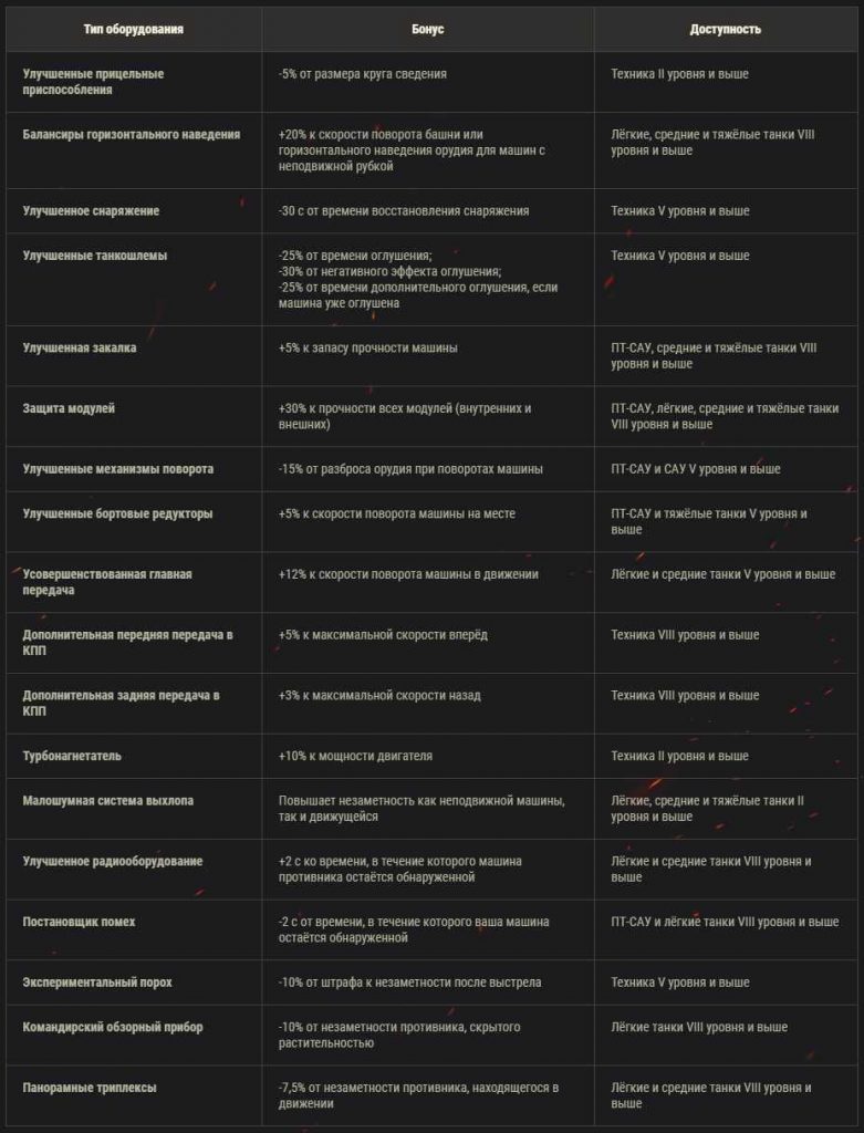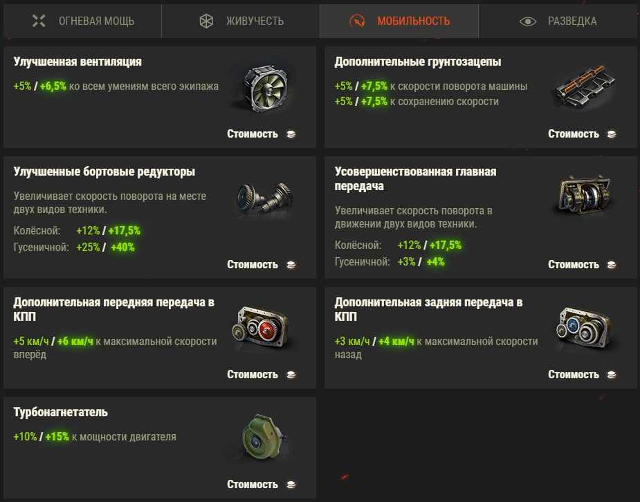 Each equipment, depending on its purpose, will fall into one of the categories. For example, the gun rammer reduces the reload time, so it belongs to the category of firepower. The only exception is Improved ventilation, which will be included in three categories at the same time, since it improves all characteristics except survivability.