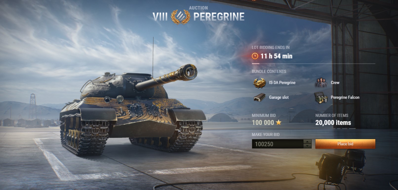 • Lot: IS-3A Sapsan, 100% crew, hangar slot and Sapsan 3D style.