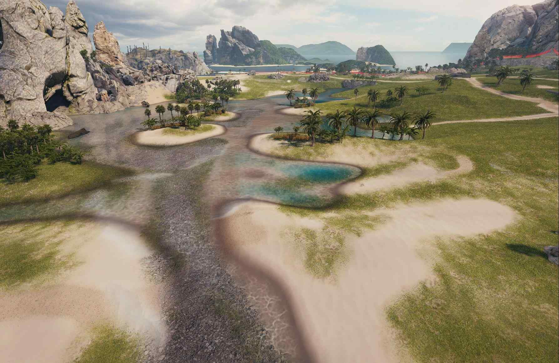 – The main collision zone for tanks is on the coastline, under the central mountain range. Several anchor points and the ability to drive over the main collision site make the gameplay at this point very intense.