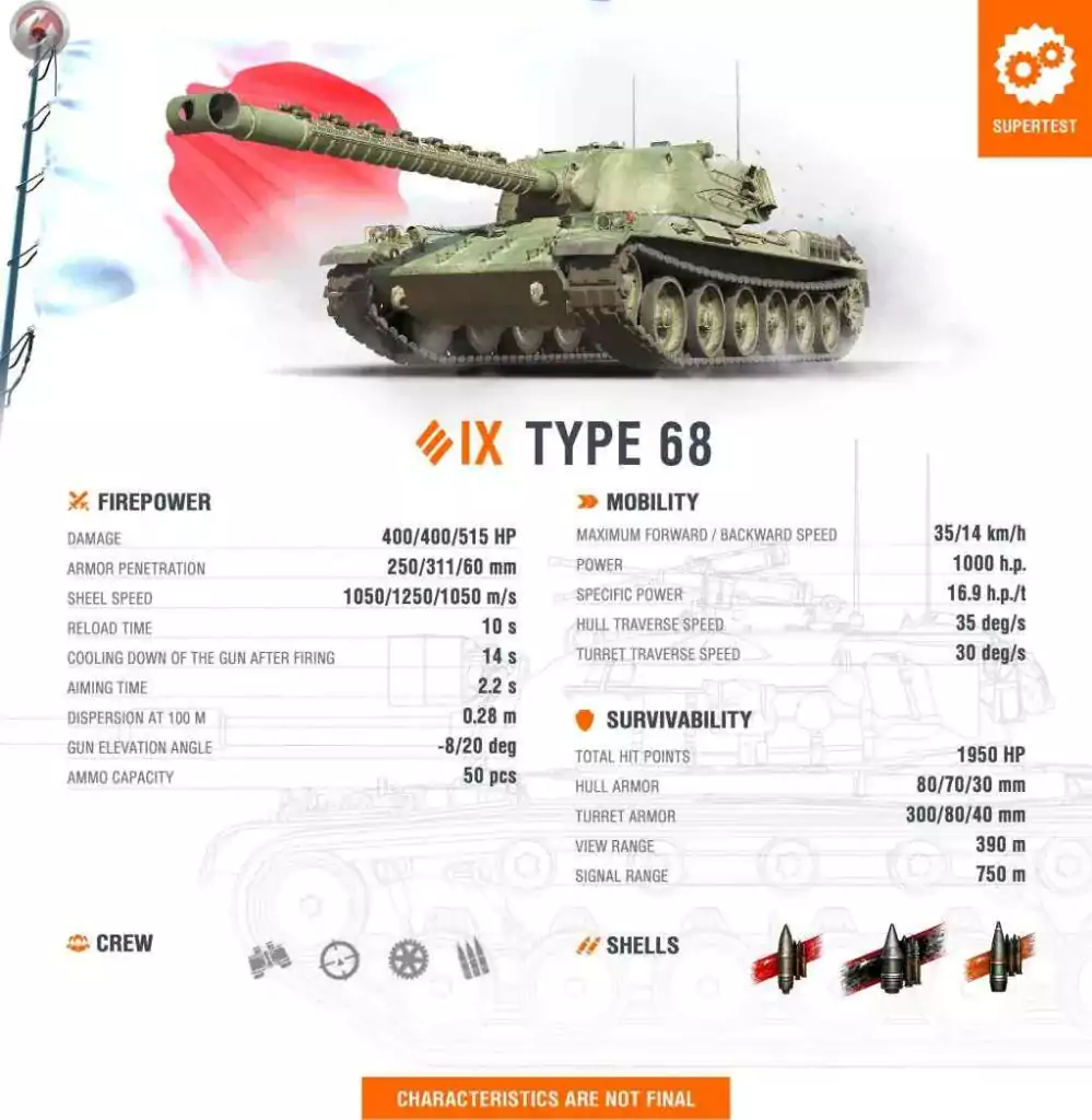 Type 68 (HT, tier IX Japanese regular tank with two mechanics hydropneumatic suspension and cooling down of the gun).