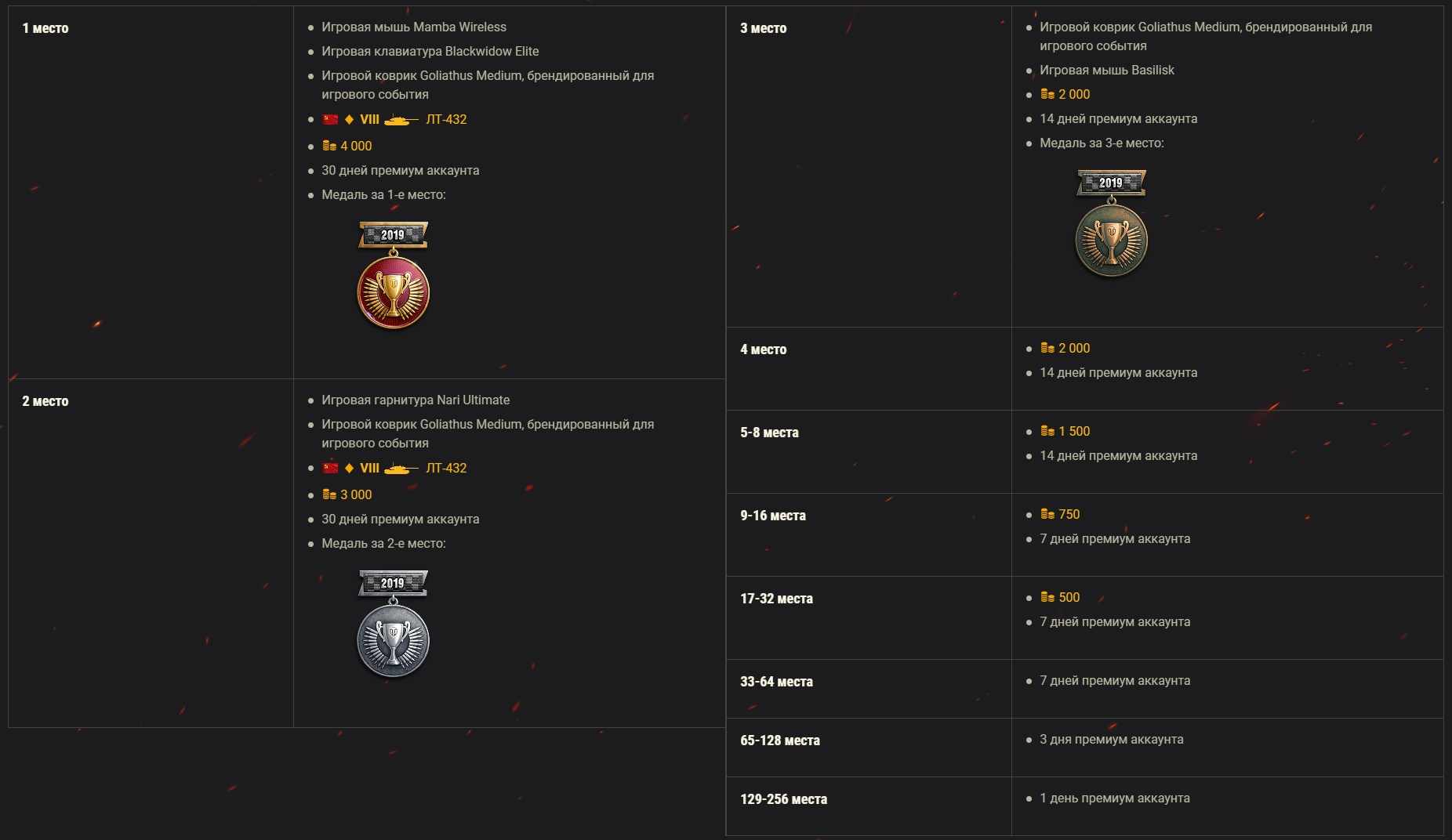 2,000 playing gold +14 Days of a tank premium account + gaming peripherals from RAZER: Basilisk mouse, Goliathus Medium mouse pad branded for a gaming event + medal.