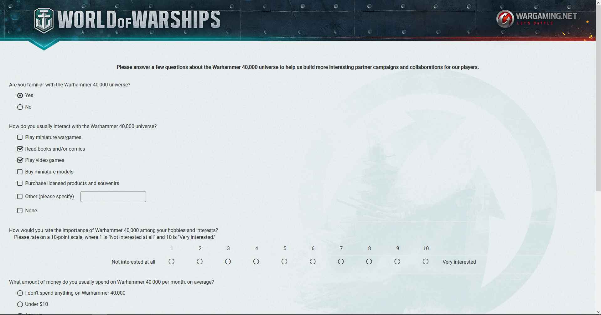 Today a redditor published an interesting post with a screenshot. This screenshot has been taken from a survey about a possible partnership with Warhammer 40k universe (like WoT).
